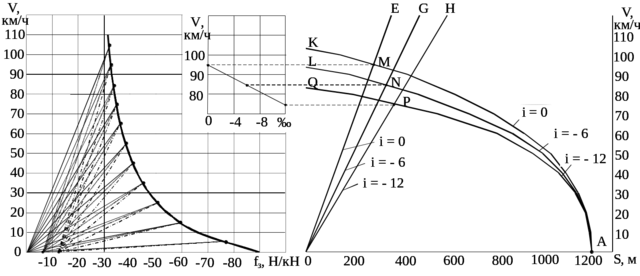 с ускоряющей характеристикой в режиме тяги и замедляющей характеристикой в режиме выбега, показывают установившиеся скорости движения поезда.
