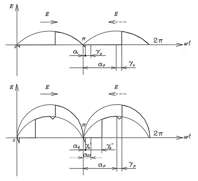 Поскольку коммутация тока происходит поочередно в контуре с большим напряжением и в контуре с меньшим напряжением, потенциальные условия для начала коммутации в плечах, находящихся в контуре с меньшим напряжением, могут создаваться позже воздействия на них управляющих импульсов с фазой α0.