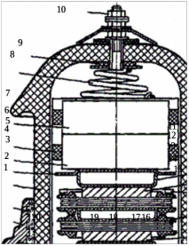 Рисунок 4.1 – Конструкция разрядника РВМУ-3,3: 1 – кожух; 2 – заливочная масса; 3 – корпус; 4,11,13,18 – монтажные части; 5,7 – вилитовые диски; 6 – прокладка; 8 – пружина; 9,17 – уплотнительные кольца; 10 – гайка; 12,15 – магниты; 14 – искровой промежуток; 16 – днище; 20 – крепежный болт