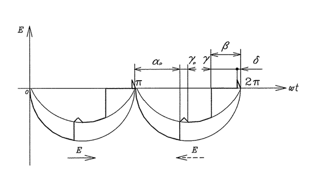 При переходе на первую зону управляющие импульсы снимаются с тиристоров плеч 1, 2, а на тиристоры плеч 5, 6 подаются импульсы, регулируемые по фазе. При уменьшении фазы αр до