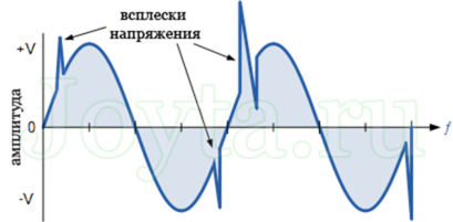 Всплески напряжения возникают в различных электрических схемах независимо от того, работают они от сети переменного или постоянного тока. Они часто возникают в самой схеме или поступают в нее от внешних источников. Высоковольтные всплески напряжения могут быстро нарастать и доходить до нескольких тысяч вольт, и именно от этих импульсов напряжения необходимо защищать электронные компоненты схемы. Форма волны переменного тока в переходном процессе изображена на рисунке 4.3.