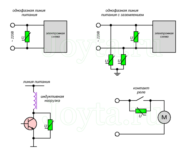 Максимальное значение тока (пиковый ток) на которое должен быть рассчитан варистор, определяется длительностью и количеством повторений всплесков напряжения. Если варистор установлен с малым пиковым током, то это может привести к его перегреву и выходу из строя. Таким образом, для безотказной работы, варистор должен быстро рассеивать поглощенную им энергию переходного импульса и безопасно возвращаться в исходное состояние. Схемы подключения варистора приведены на рисунке 4.6.