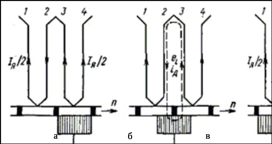 Под воздействием электродвижущей силы самоиндукции в короткозамкнутом витке 2 – 3 протекает высокий дополнительный электрический ток, ввиду того, что сопротивление контура низкое. В точке соприкосновения щетки с левой пластиной дополнительный ток направлен в противоположную сторону току якоря, а в точке соприкосновения щетки с правой пластиной направление этих токов одинаково.