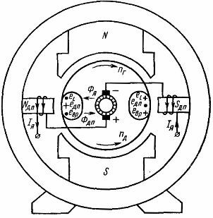 Ввиду того что оба эти потока наводятся одним током (током якоря), следовательно можно подобрать количество витков обмотки добавочных полюсов и величину воздушного зазора между ними и якорем таким образом, чтобы потоки были равными по значению при любой величине тока якоря. Поток добавочных полюсов будет всегда компенсировать поток якоря и электродвижущая сила вращения в коммутируемом витке будет отсутствовать.