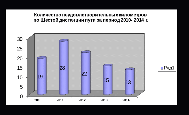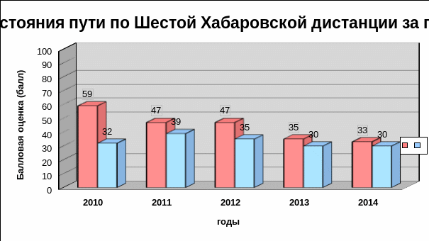 Как видно из вышеприведенных таблиц, состояние пути на Шестой Хабаровской дистанции в 2014 году улучшилось, балловая оценка состояния пути при плане 33 единицы составила 30 баллов. В 2013 году при плане 35 баллов выполнение составило 30 баллов. Количество неудовлетворительных километров уменьшилось с 14 до 13 км. Количество неисправностей 3-й степени уменьшено до 93 против 101 шт. в 2013 г. Неисправностей 2-ой степени по сравнению с 2013 годом уменьшилось и составило 16379 шт. против 18433 шт.