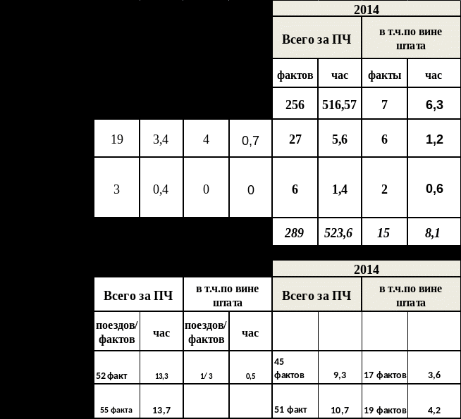 В дистанции пути допущено увеличение общего числа задержанных поездов по сравнению с 2013 годом. Из общего числа задержек в 2014 году (из 334 фактов) непосредственно по вине работников дистанции пути- 32 факта- 11,7 часа, остальные задержки отнесены как задержки, вызванные особой технологической необходимостью, или форс- мажорными обстоятельствами.