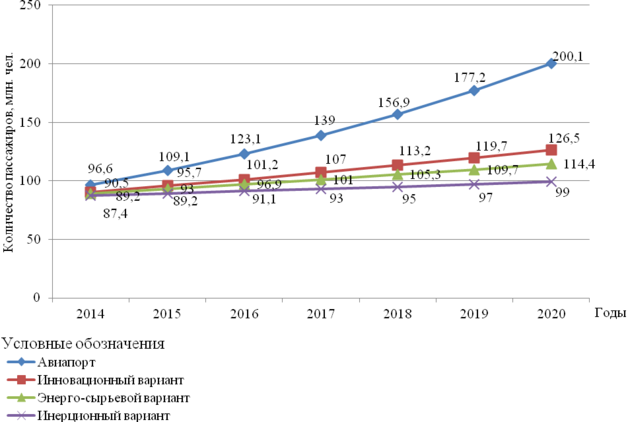 Сценарий инерционного развития транспортной системы России предполагает, что пассажиропоток аэропортов будет расти по 2,11% в год и к 2020 году составит 99 млн. человек. Прогноз основан на следующих направлениях: поддержании доминирования в экономике энерго-сырьевого комплекса при резком замедлении производства и экспорта углеводородов и отставании в развитии энергетической и транспортной инфраструктуры; снижением численности населения до 140 млн. человек; повышением экономической дифференциации населения; преобладанием пассивной модели поведения бизнеса; отказом от реализации новых долгосрочных глобальных проектов и программ с участием государства.