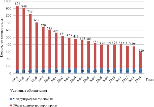 За рассматриваемый период наблюдается тенденция снижения аэропортовых комплексов. Так, за период с 1995-2014 гг. количество аэропортов сократилось на 656, что способствовало снижению объемов предложения в сфере аэропортового обслуживания и увеличению неудовлетворительного спроса со стороны потребителей, в первую очередь на региональных и местных направлениях.