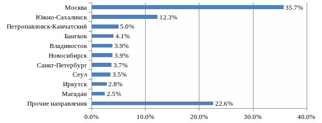 Таким образом, на основных направлениях, за исключением города Москвы, отсутствуют ежедневные рейсы, не обеспечивается их достаточная частота. Как следствие, наблюдается неравномерное распределение пассажиропотока и высокий уровень концентрации на московском направлении, что как уже было отмечено ранее, обусловлено территориальной удаленностью российского Дальнего Востока от европейской части страны и высокой рентабельностью данного направления.