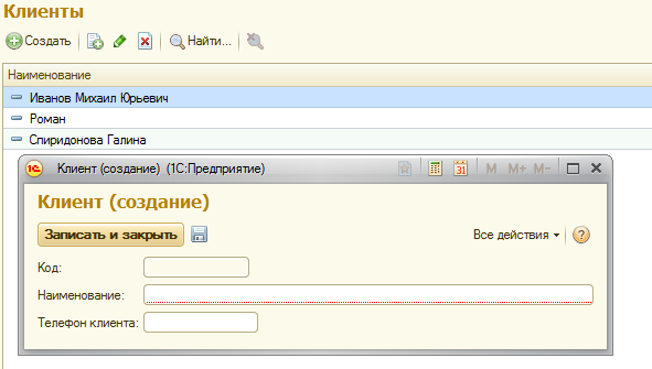 Список клиентов представлен в виде обычной формы и будет обладать реквизитами Наименование, Код и Телефон Клиента. Найти список клиентов можно в подсистемах Оказание услуг и Бухгалтерия.