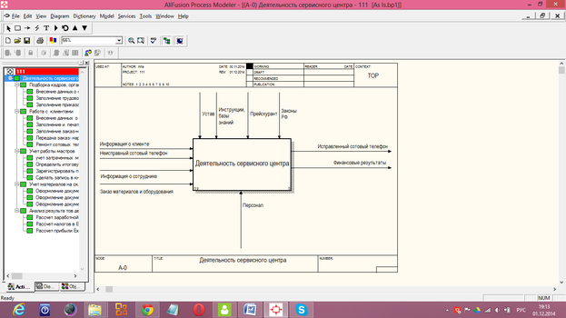 Процесс моделирования какой-либо системы в IDEF0представим в виде наиболее абстрактного уровня описания системы в целом. Контекстом всего процесса является "Деятельность сервисного центра" (рисунок 9).