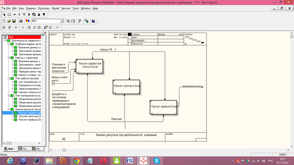 Входными данными процесса Анализ результатов деятельности компании (рисунок 15) является запись в книге учета, плановые и фактические показатели, документы по учету материалов на складе. Расчет заработной платы, налогов и прибыли производится в Excel.