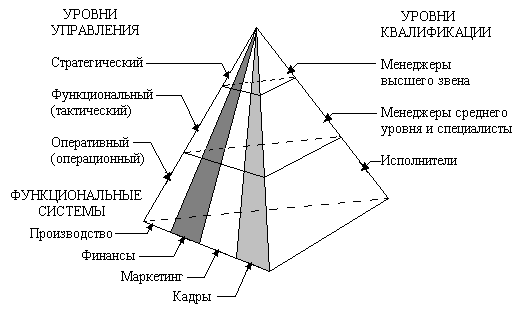 Из рисунка 1 видно, что чем выше по значимости уровень управления, тем меньше объем работ, выполняемых специалистом и менеджером с помощью информационной системы. Однако при этом возрастают сложность и интеллектуальные возможности информационной системы, и ее роль в принятии менеджером решений. Любой уровень управления нуждается в информации из всех функциональных систем, но в разных объемах и с разной степенью обобщения.