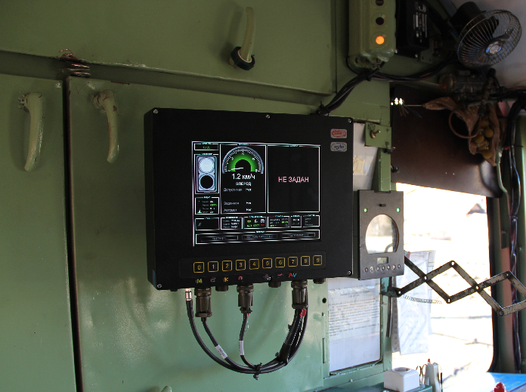 н) Информирование машиниста о показаниях светофоров, числе свободных блок-участков, фактической скорости с точностью до 1 км/ч и допустимой на данном участке пути скорости движения, кривой торможения, а также о текущем времени с корректировкой по астрономическому времени, координатах местоположения локомотива с точностью до 30 м при помощи спутниковой навигации, соблюдении графика движения поезда, названиях станций, номерах стрелок, светофоров, перегонов и т. п., расстояниях до контрольных точек (станции, переезда, моста, тоннеля, стрелки, светофора, токораздела, опасного места и др.), хранящихся в электронной карте блока электроники БЭЛ. Локомотивное устройство КЛУБ приведен на рисунке 1.5.