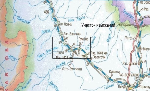 Исследуемый участок расположен на разъезде Сосновый, на перегоне Ларба – Лумбир, на ПК 22265 – ПК 22315 Дальневосточной железной дороги на участке Хани – Тында. Местонахождение объекта см. на рис. 1.