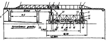 1 – грузовая тележка; 2, 3 – блоки; 4 – ферма; 5, 7, 20 – лебедки; 6 – пост управления оператора; 8 – средняя поперечная балка; 9 – ограничитель грузоподъемности; 10 – откидные балки; 11 – каретка портала; 12 – ограждение; 13 – гидравлический цилиндр подъема фермы; 14 – стойка портала; 15 – трехосная тележка; 16 – рама; 17 – силовая установка; 18 – пульт управления платформой; 19 – кабина управления; 21 – роликовый конвейер; 22 – укладываемое звено