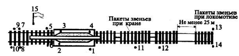 1 – место машиниста-водителя; 2 – место машиниста-оператора; 3 и 4 – место монтеров пути - стропальщиков; 5-14 – места монтеров пути нижней группы; 15 – место руководителя работ