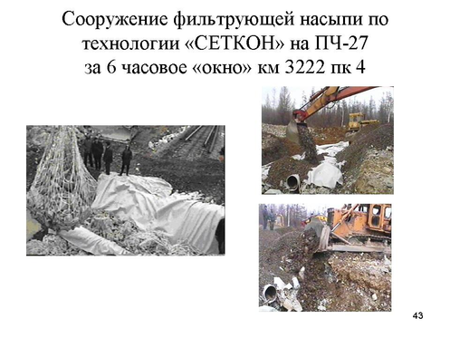 В качестве водопропускных сооружений эффективны фильтрующие насыпи по технологии «Сеткон» (сетчатые контейнеры с фракционным скальным грунтом (рис. 4.2 – Патент 2186170 РФ ДВГУПС, реализован и успешно эксплуатируется на 3223 КМ БАМ)). Продолжительность «окна» при этом необходима не более 6 – 8 часов, по сравнению с традиционным устройством фильтрующей насыпи в условиях эксплуатации (36 – 48 часов).