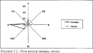Роза ветров в сравнении в летний и в зимний период приведена на рисунке 2.1, роза ветров (среднемноголетняя) приведена на рисунке 2.2.