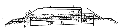 Гидроизоляционные покрытия укладывают на насыпях, откосы которых подвержены сплывам, при наличии углублений на основной площадке, способствующих увлажнению грунта атмосферными осадками и потере устойчивости откосов, также она предотвращает проникновение влаги в тело насыпи. Эта мера целесообразна в комплексе с устройством поддерживающих сооружений. На рисунке 3.8 представлена схема устройства гидроизоляционного покрытия.