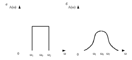 Рисунок 1.3 – АЧХ полосового фильтра: а – АЧХ идеального фильтра, б – АЧХ реального фильтра