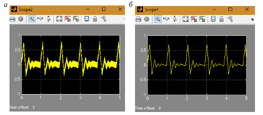 Для получения осциллограмм фильтруемого сигнала используется элемент Scope. На Scope 2 подается входной сигнал, который состоит из ЭКГ сигнала и наложенной на него помехи 50 Гц, после этого сигнал проходит Т-образный двойной фильтр и подается на Scope1. Проходя через фильтр амплитуда гармоники с частотой 50 Гц значительно падает и на Scope1 мы получаем исходный сигнал, без помех. Полученные осциллограммы представлены на рисунке 1.7.