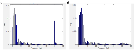Рисунок 1.8 – Анализ Фурье входного и выходного сигнала: а – входной сигнал, снятый с Scope2; б – сигнал на выходе фильтра, снятый с Scope1
