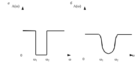 Рисунок 1.4 – АЧХ режекторного фильтра: а – АЧХ идеального фильтра, б – АЧХ реального фильтра