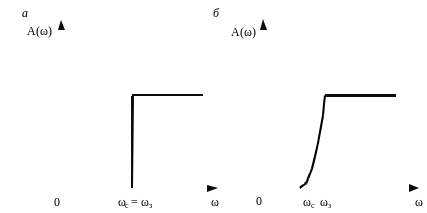 Рисунок 1.2 – АЧХ фильтра верхних частот: а – АЧХ идеального фильтра, б – АЧХ реального фильтра