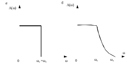 Рисунок 1.1 – АЧХ фильтра низких частот: а – АЧХ идеального фильтра, б – АЧХ реального фильтра