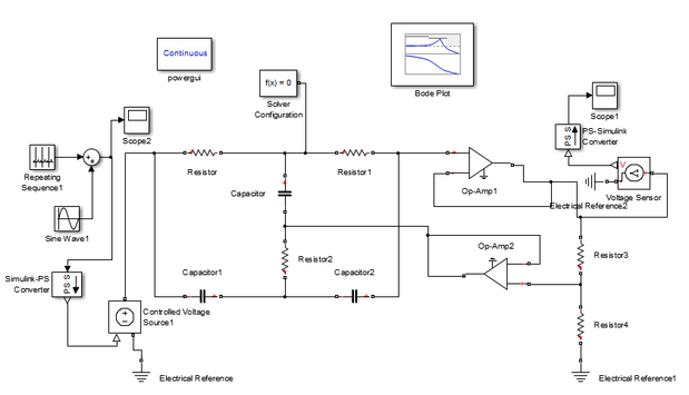 Для уменьшения полосы заграждения, в данном фильтре используются операционные усилители, а так как они имеет свой собственный источник питания, то фильтр становится активным. В программной среде Matlab был смоделирован двойной Т-образный мостовой режекторный фильтр. В качестве входного сигнала используется сигнал по форме схожий с ЭКГ сигналом, который задается элементом Repeating Sequence. На входной сигнал была наложена гармоника с частотой 50 Гц и амплитудой 0,1 В, которая моделирует наводимые помехи из сети питания (Sine Wave). Для построение АЧХ используется элемент Bode Plot, а для быстрого преобразования Фурье (FFT – анализа) используется элемент powergui. Схема данного фильтра, смоделированного в программной среде Matlab, представлена на рисунке 1.6.