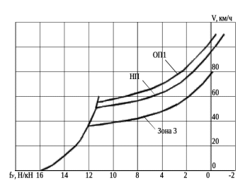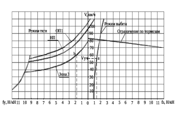 Точки пересечения линий, проведённых из значения уклона до характеристики fу(V) точка a, b на рисунке 4.4 с тяговой характеристикой показывают установившиеся скорости движения поезда.
