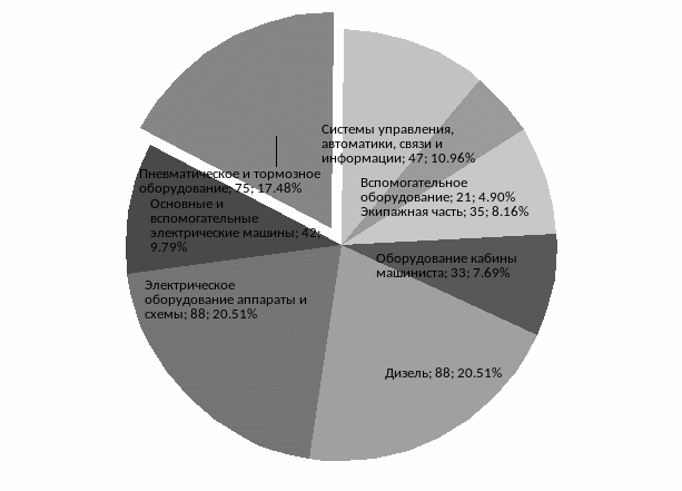 Как мы видим, статистика показывает довольно большое количество отказов пневматического и тормозного оборудования на ряду с остальным оборудованием локомотива. Поэтому требуется обратить внимание на данную проблему, поскольку устранение поломок уменьшит вероятность отказа тормоза, что снизит вероятность крушения поезда и может сохранить большое количество человеческих жизней и естественно предотвратить большие финансовые потери.