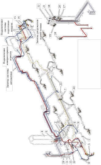 5 – соединительный рукав; 6 – кран 1-32; 7 – кран 4300В УХЛ1; 8 – кран 4314М У1; 9 – кран 4331 У1; 10 – фильтр ФВ 15/10/01; 11 – главный резервуар; 12 – воздушный резервуар; 13 - уравнительный резервуар; 14 – тормозной цилиндр; 15 – клапан 1-11(142-01); 16 – клапан 2-2У1; 17 – выключатель цепей управления 259.40; 18 – клапан аварийного экстренного торможения 130.30;