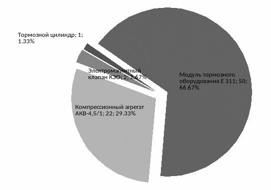 Распределение количества отказов пневматического и тормозмного оборудования приведено в таблице 1.2.