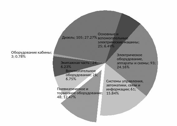 Рисунок 1.2 – Распределение абсолютного и процентного количества отказов оборудования гарантийных тепловозов 2ТЭ25А в ТЧ-11 Тында за 8 месяцев 2013 год