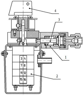 Выключатель состоит из: корпуса – 1; с пакетным выключателем – 2; поршня – 3; и съемного ключа – 4; который имеет три фиксированных положения – «Включено», «Выключено», «Смена кабин». Первое положение («Включено») устанавливается поворотом ключа до упора по часовой стрелке, второе («Выключено») – поворотом ключа из первого положения на 90 градусов против часовой стрелки, третье («Смена кабин») – поворотом еще на 90 градусов.