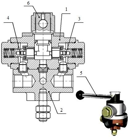 Кран резервного управления (рисунок 2.3) предназначен для управления тормозами в аварийной ситуации, то есть в случае отказа электронной составляющей крана или контроллера. Рукоятка крана резервного управления имеет три положения: «Тормоз», «Отпуск», «Перекрыша».