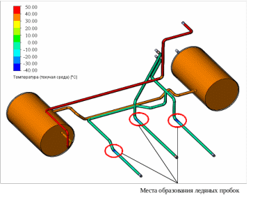 Как мы видим, действительно, в местах изгиба тормозной и питательной магистралей имеются участки наиболее подверженные остыванию до температуры равной окружающей среде, следовательно, от этого и происходит образование заторов.