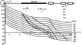 Коэффициент χ зависит от характеристики пневматической сети и условий охлаждения трубопровода и имеет одинаковые значения для участков магистрали с идентичными условиями охлаждения, но различные для моментов пуска и остановки компрессора. Для участка магистрали от компрессора до промежуточного холодильника (змеевика) коэффициент χ равен соответственно 0,0952 и 0,0924, для промежуточного холодильника – 0,048 и 0,0478, для главных резервуаров – 0,0386 и 0,04. Полученное уравнение с учетом значений коэффициента χ позволяет аналитически определить температуры внутренней поверхности трубы по длине магистрали при любых температурах атмосферного воздуха. На рисунке 4.2 и 4.3 построены такие зависимости в диапазоне температур от плюс 50 °С до минус 50 °С для пневмомагистрали с компрессором типа КТ6, работающем в повторно-кратковременном режиме с продолжительностью включения (ПВ), равной 33 %. При других ПВ компрессора графики строятся с помощью той же формулы (4.1), но с соответствующими замеренными для каждой ПВ значениями