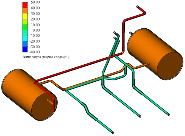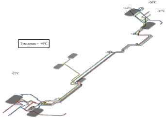 Установив скорлупу ППУ на проблемные участки трубопровода и задав все её необходимые для расчёта технические характеристики, а именно: плотность 55–60 кг/м3; теплопроводность – 0,025 Вт/м∙К; удельную теплоёмкость – 1,47 кДж/кг на 1 °С. Выбрав необходимый диаметр, подходящий под наружный диаметр нашего трубопровода и толщину скорлупы равной 7 мм, запустим повторный расчёт тепловых потоков тормозной системы, только теперь с установленным теплоносителем в места образования ледяных пробок.
