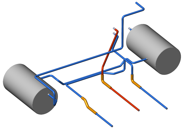 При построении модели воздухопровода заносились реальные данные, тормозная и питательная магистраль выполнены из «стали 3». Все изгибы и диаметры магистралей, аналогичны реальному воздухопроводу. В том числе объём воздушного резервуара, объёмы главных и воздушных резервуаров соответствуют действительности.