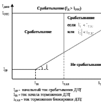 Под чувствительным реле понимается дифференциальная защита с торможением, зона срабатывания которой показана на рисунке и определяется уставками.