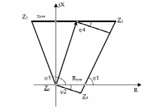 также вершинами Z1Z2, получаемыми путем отсечения ненаправленной четырехступенчатой характеристики углами φ1 и φ3 с целью охвата дуговых повреждений и обеспечения надежности и быстроты срабатывания с учетом различных влияющих факторов. Небольшой наклон верхней стороны (φ4) обеспечивает повышение селективности при внешних дуговых повреждениях