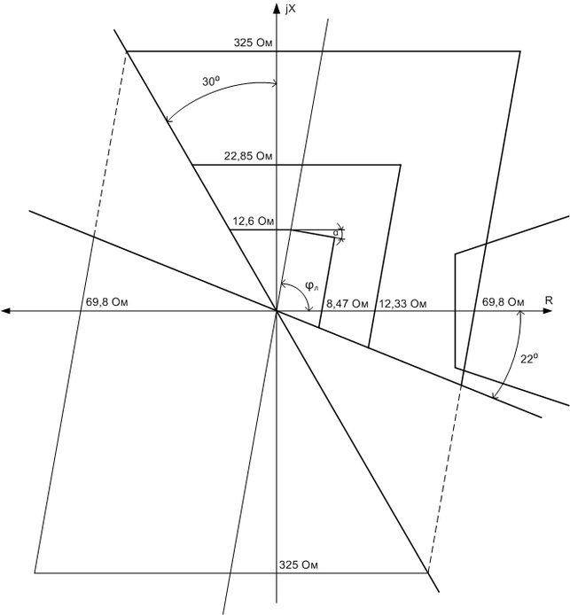 где X – проекция вектора Z на ось jX; R – проекция вектора Z на ось R плюс значение сопротивления дуги в месте замера c учетом обеспечения требуемой чувствительности к КЗ;