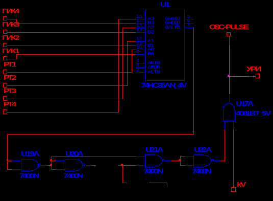 В момент равенства значений управляющего воздействия и изменяющегося кода на выходе «OALTB» формируется сигнал, поступающий на узел формирования импульса, состоящий из 4-х элементов 2-И-НЕ и RC-цепочки. От параметров сопротивления и ёмкости RC-цепочки зависит ширина управляющего импульса, поступающего на узел распределения импульсов. Логический элемент И U17Aпропускает управляющие импульсы на узел распределения импульсов в зависимости от наличия признака положительной разности (наличии логической единице, поступающей с выхода элемента сравнения скорости через разъём «kV») логический элемент И выдаёт управляющий импульс на узел распределения импульсов через разъём «УРИ». При отрицательной разности управляющий импульс не пропускается.