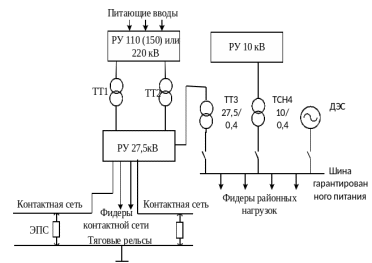 Тяговые подстанции переменного тока питаются от сетей 110(220) кВ, посредствам понижающего трансформатора обычно расположенного на территории подстанции, обмотки высшего напряжения которого подключаются к линии 110(220) кВ , а одна из обмоток низшего 27.5 кВ служит для питания электроподвижного состава. Другая обмотка для питания нетяговых потребителей, через еще один понижающий трансформатор выполняется на напряжении 0, 4, 6, 10 или 35 кВ. Для питания потребителей относящихся к особой группе первой категории надёжности на подстанции устанавливают дополнительный ввод и дизельную электростанцию (ДЭС). Принципиальная схема тяговой подстанции изображена на рисунке 1.2