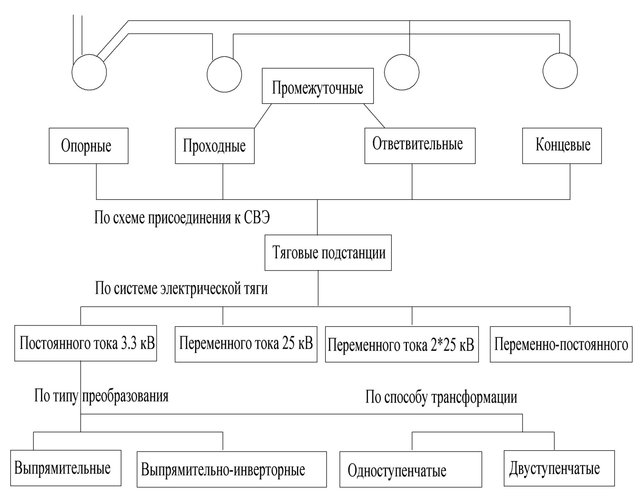 Для поддержания уровня напряжения и снижения электрических потерь в сети, тяговые подстанции имеют различные виды присоединения к системе внешнего электроснабжения(СВЭ).