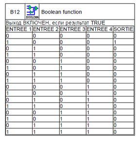 У функции 4 входа и поэтому возможно 16 комбинаций. Все эти комбинации можно найти в таблице истинности. Для каждой из комбинации можно настроить результат, возвращаемый функцией. Количество настраиваемых параметров зависит от количества входов, подсоединенных к функции. Таблица истинности блока представлена на рисунке 7.1