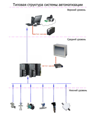 нижний уровень - уровень датчиков и исполнительных механизмов;